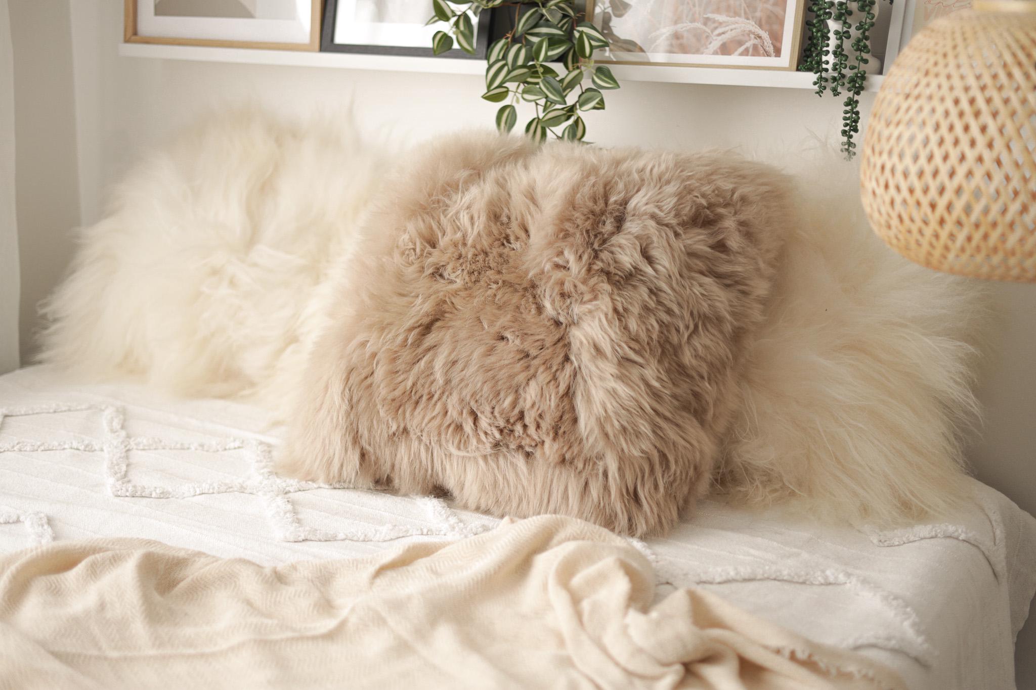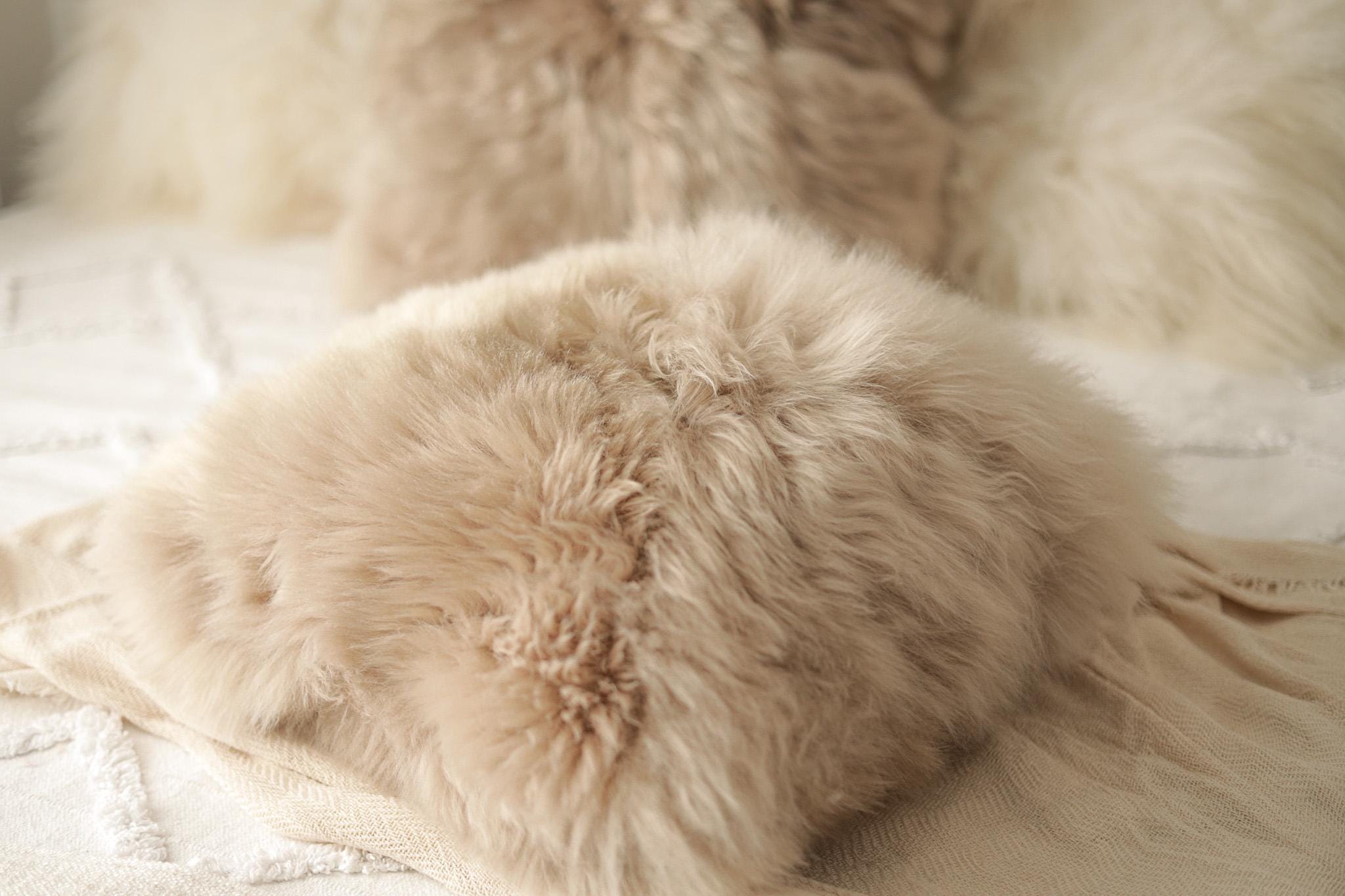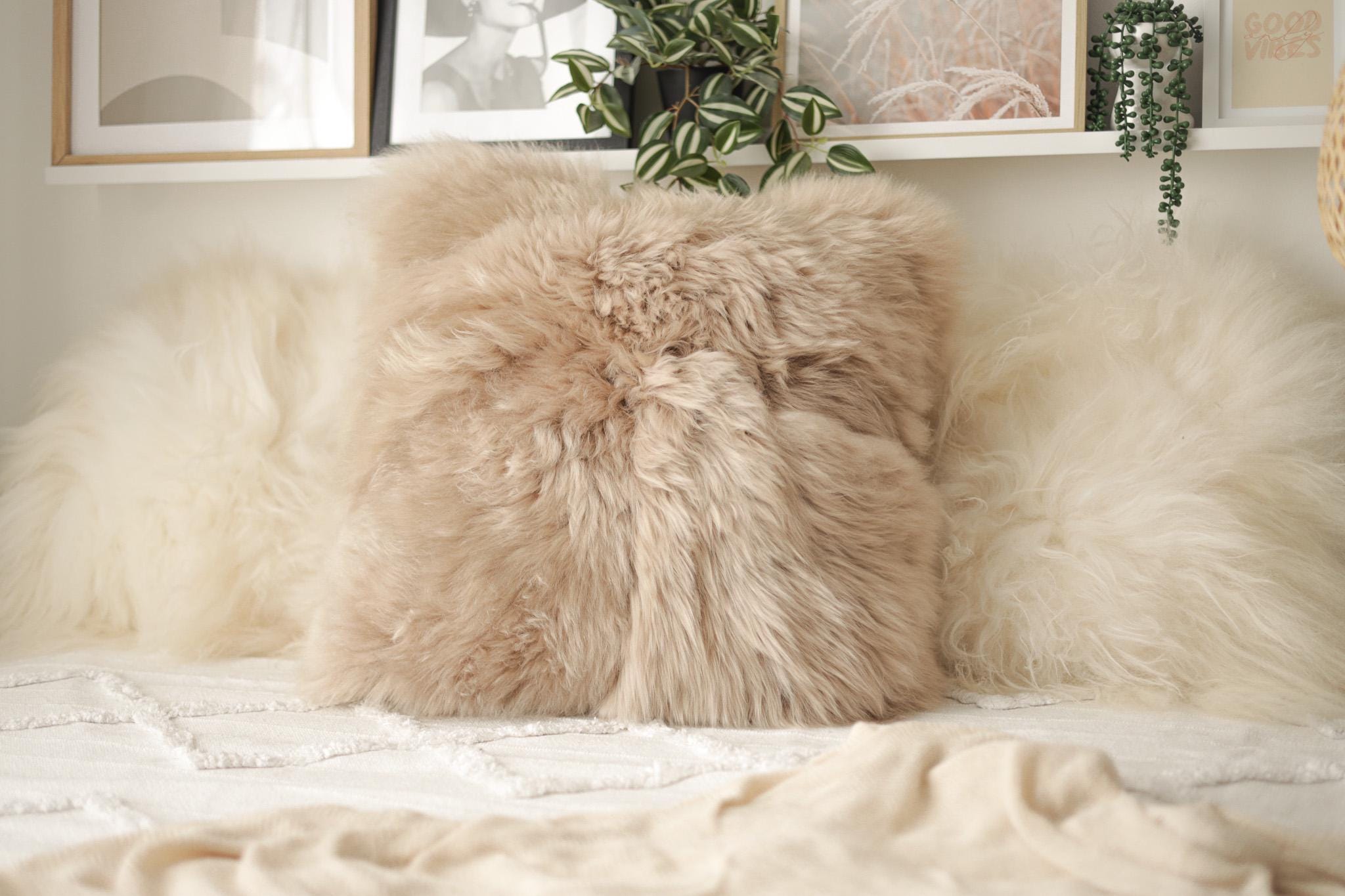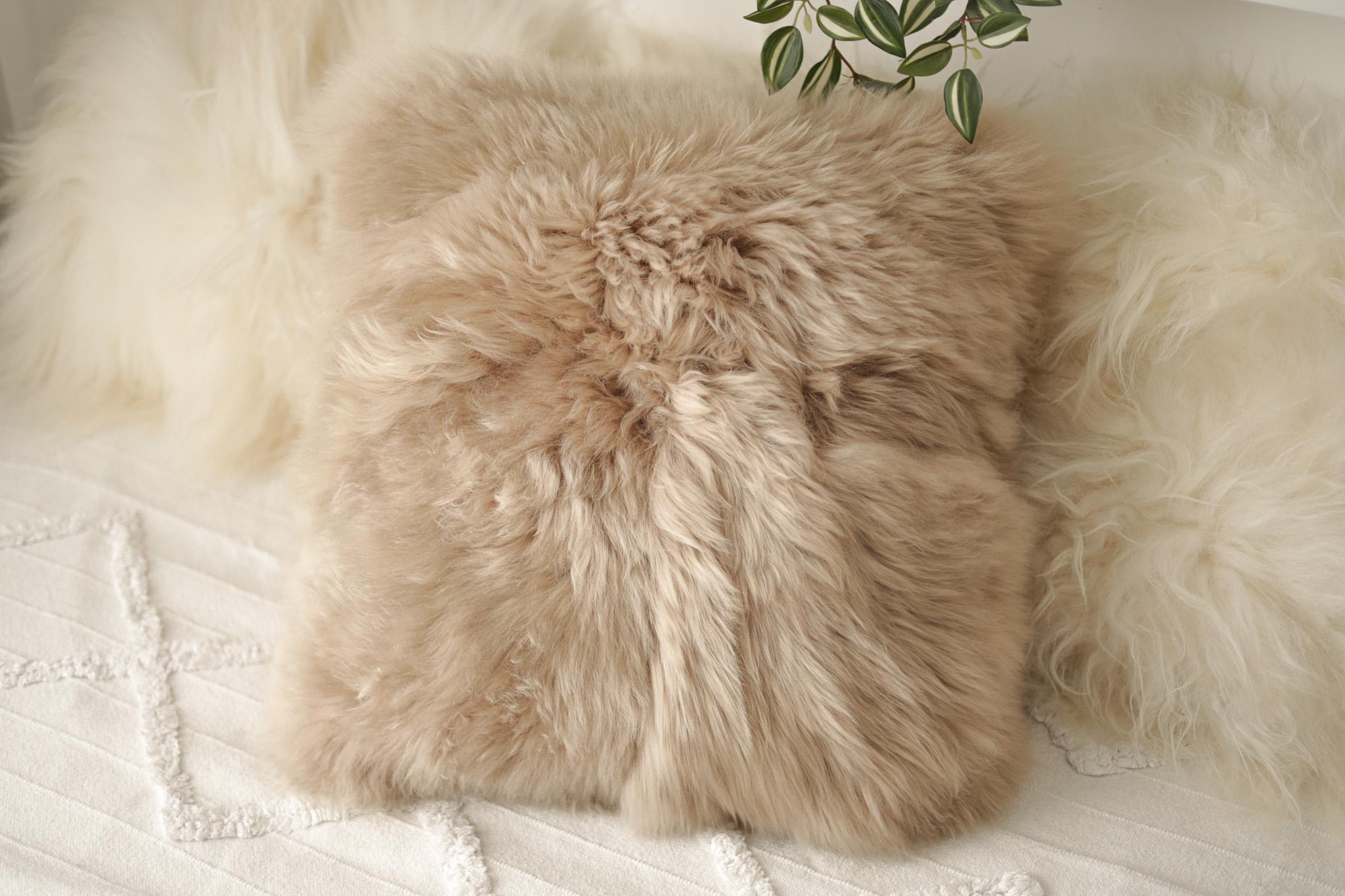 Beautiful Natural Cappuccino Color Real Sheepskin Decorative Cushion Both Side Fur Scandinavian Style