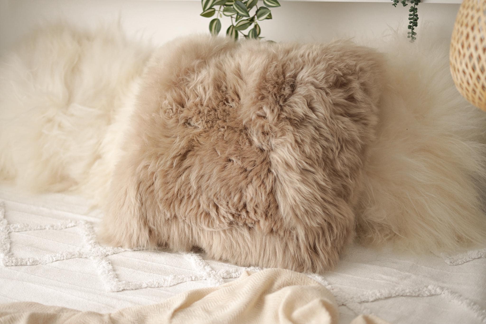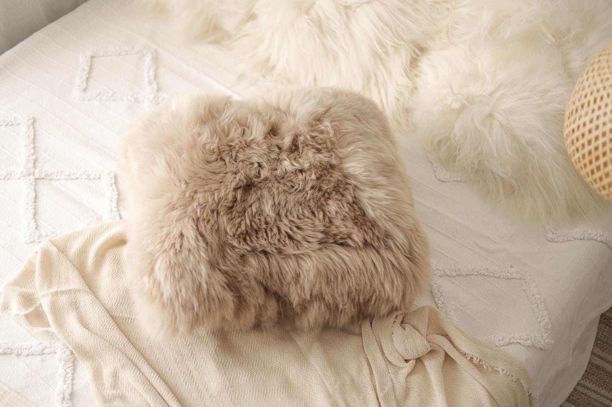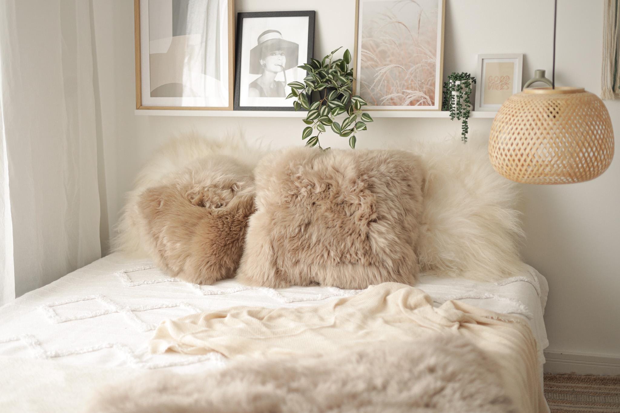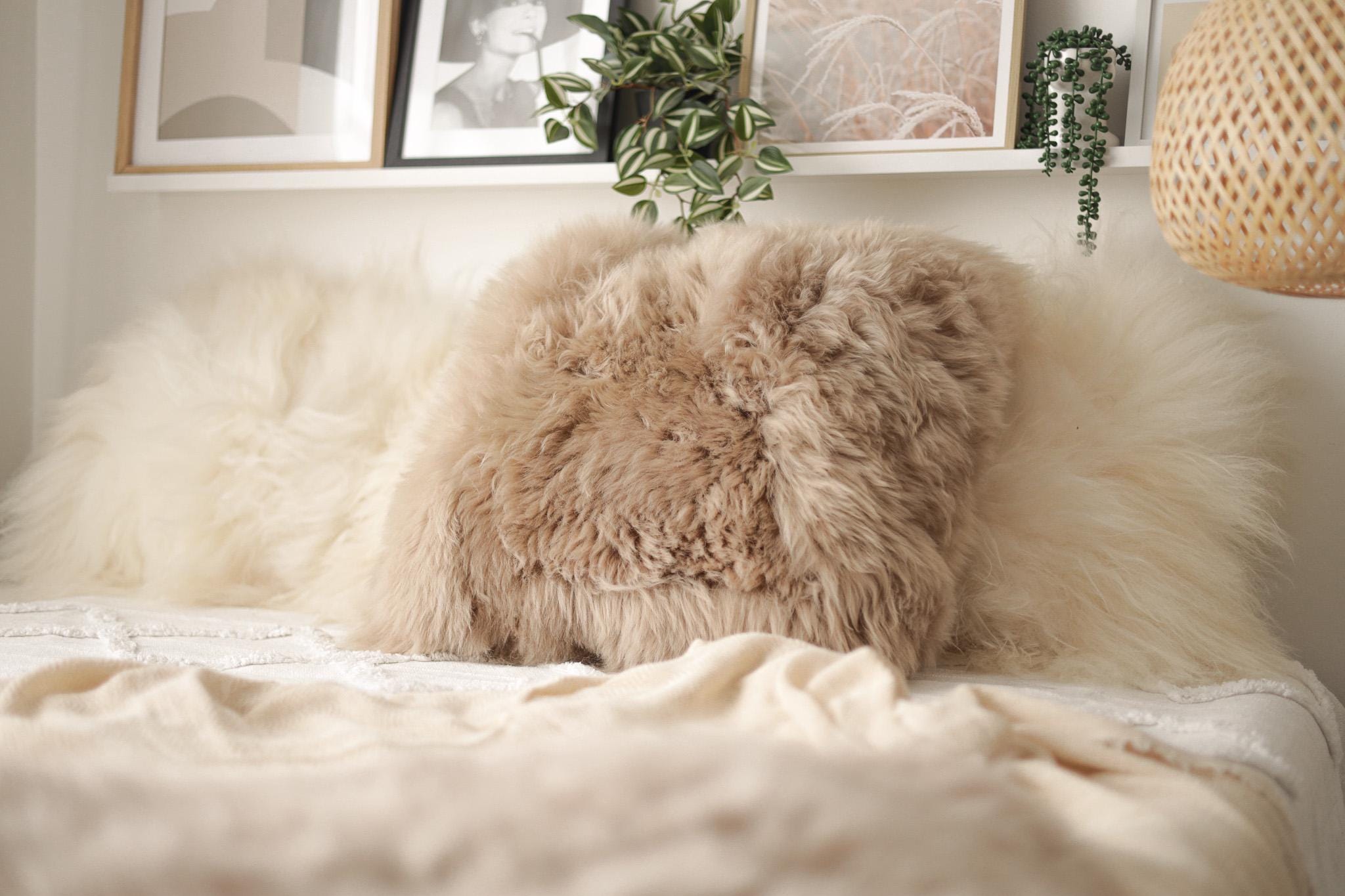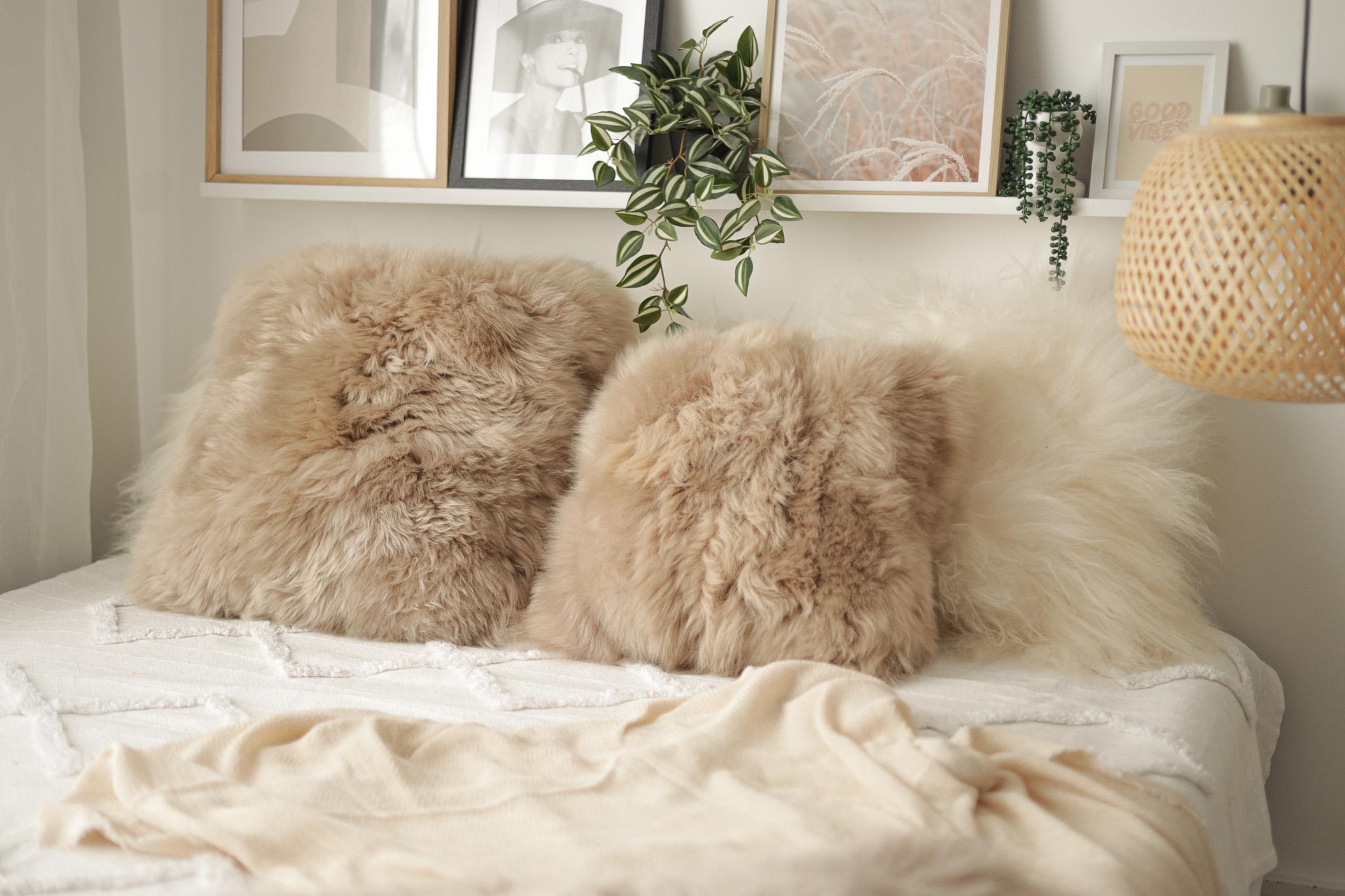 Beautiful Natural Cappuccino Color Real Sheepskin Decorative Cushion Both Side Fur Scandinavian Style